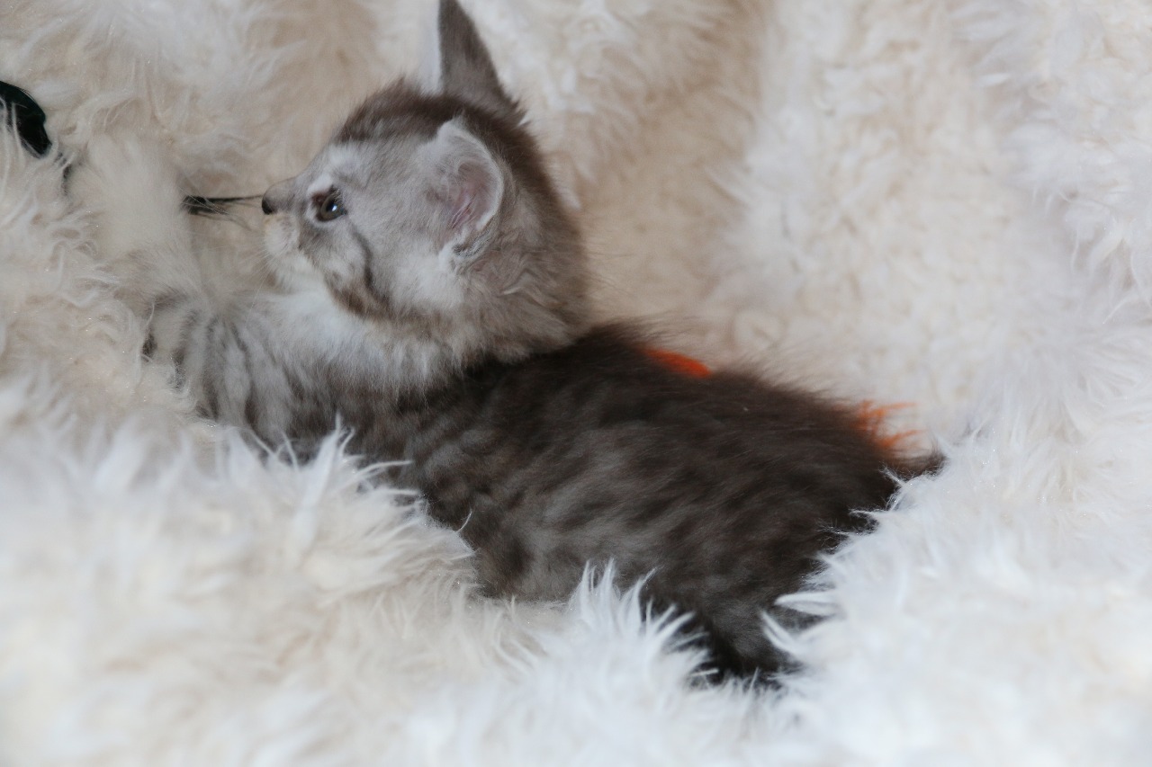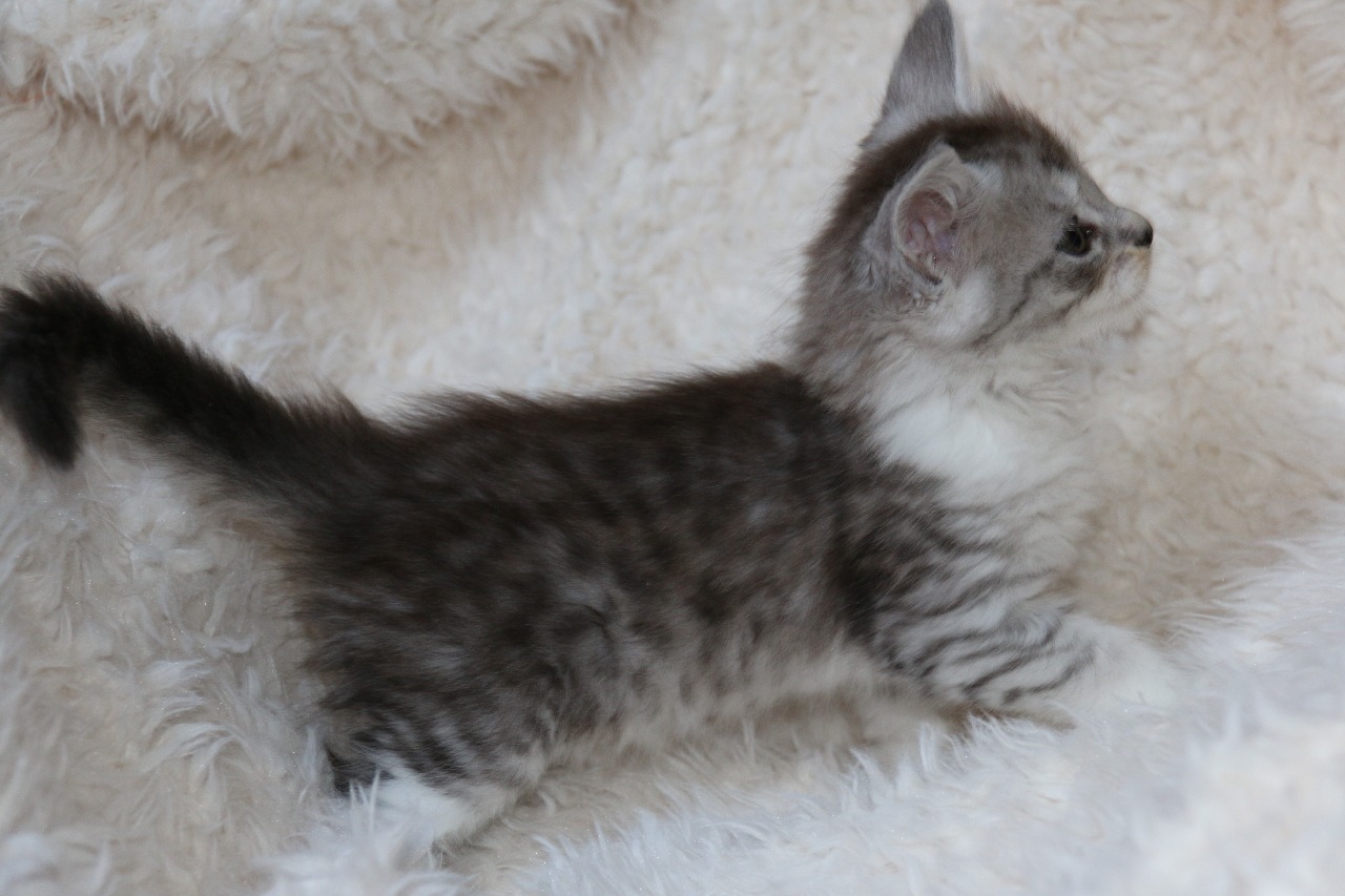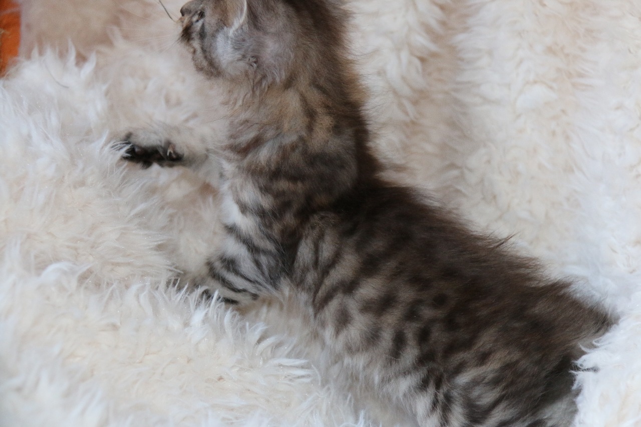 3) La femelle black silver spotted tabby et blanc est née à 12h50 avec un poids de 119 gr .