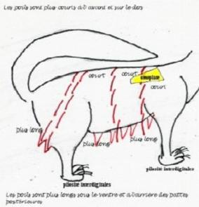 Les poils sont plus courts à l’avant et sur le dos , les poils sont plus longs sous le ventre et à l’arrière des pattes postérieures